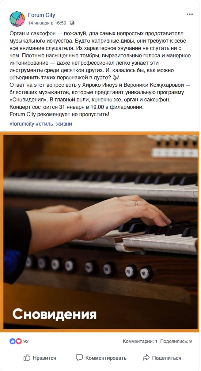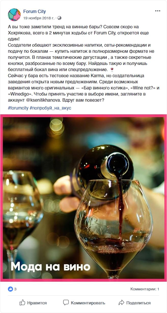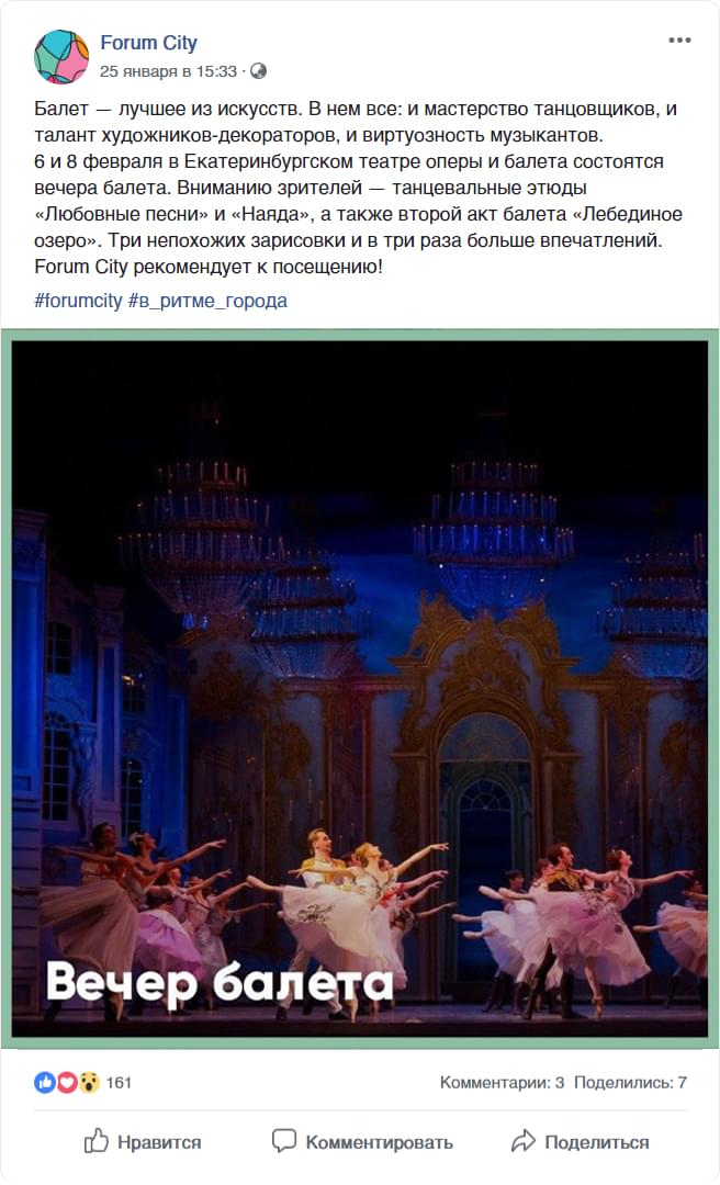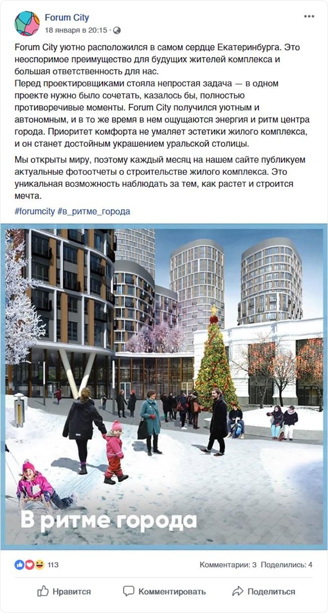 Концепция сообществ звучит коротко и емко: «В радиусе счастья». В аккаунтах жилого комплекса мы рассказываем о резонансных событиях, мероприятиях и самых вкусных местах Екатеринбурга, которые располагаются в сердце уральской столицы, а значит, не дольше чем в 10 минутах на авто от Forum City.