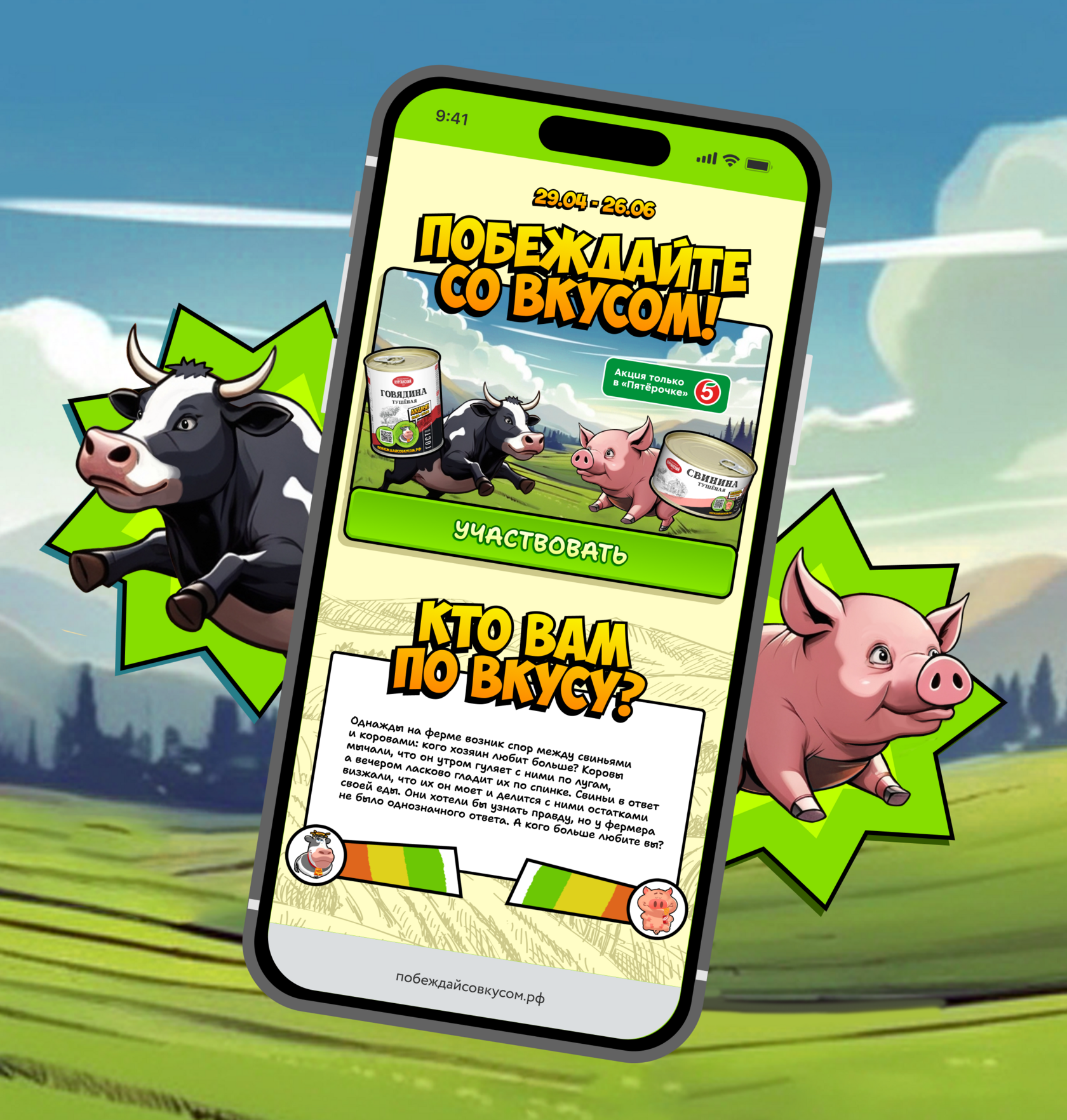 Отрисовали аппетитных жителей фермы и придумали вескую причину противостояния: «Кого любят больше?» А ещё дали участникам промо место «судей» и право решать, на чьей стороне вкуснее. Для этого они покупали определенную SKU и наслаждались вкусом того, кого любят больше.