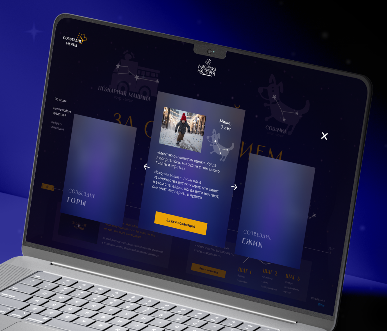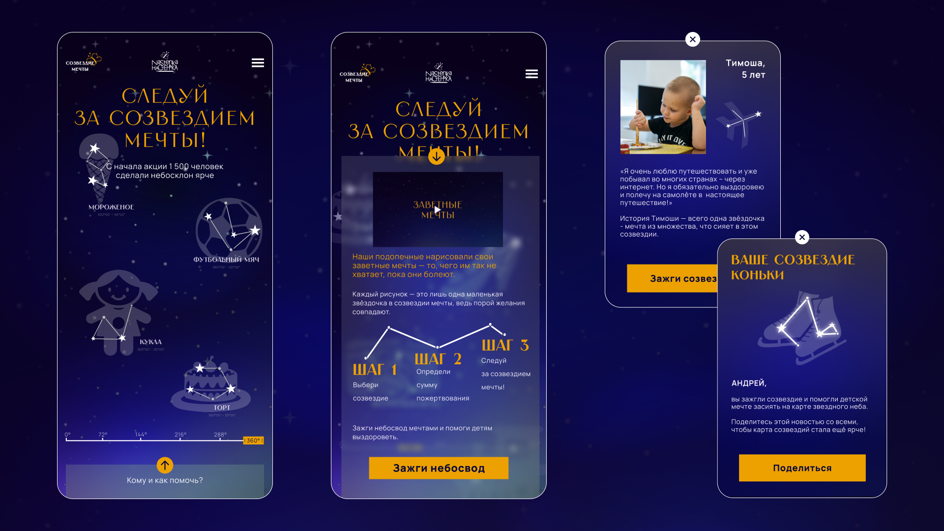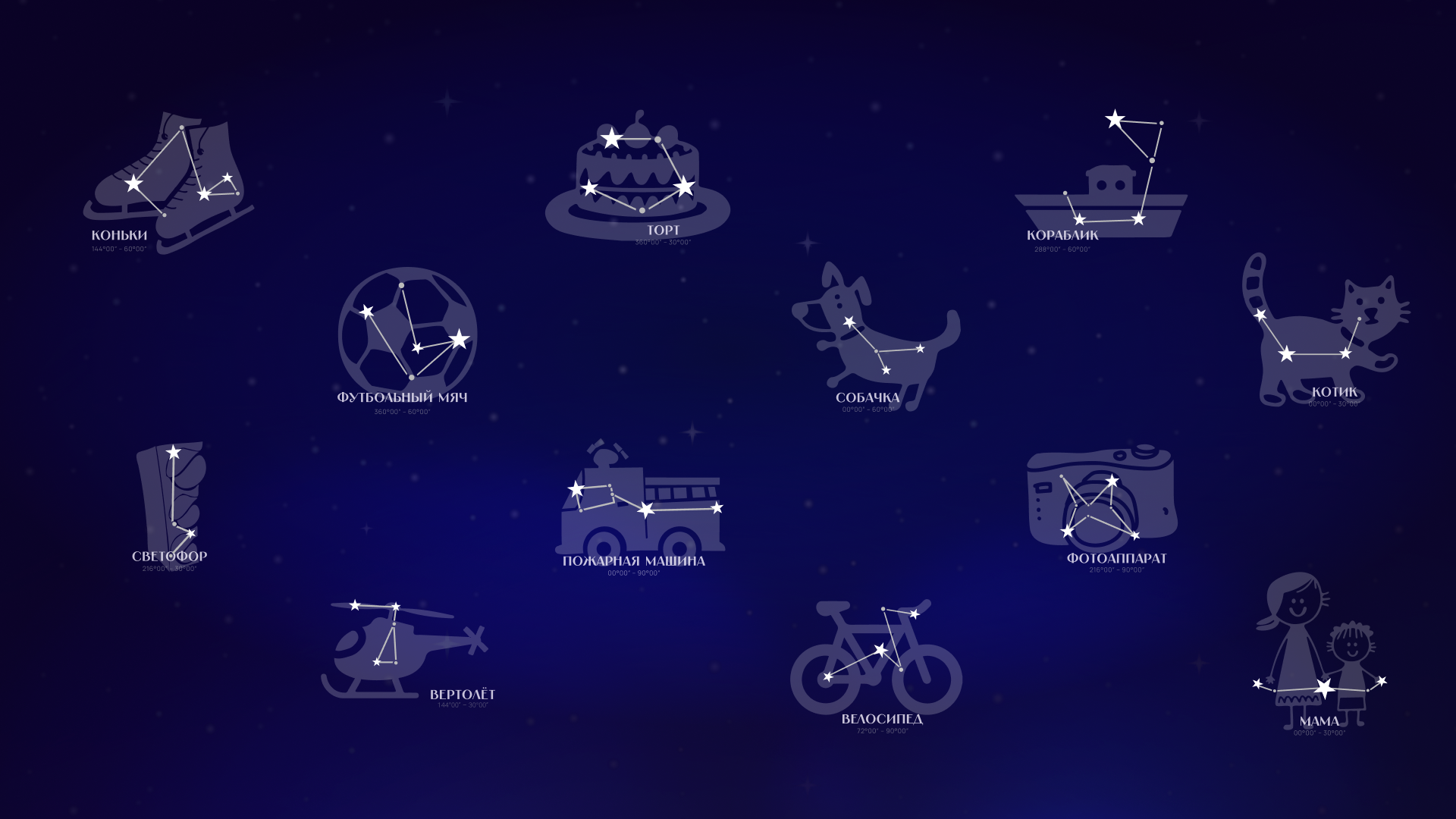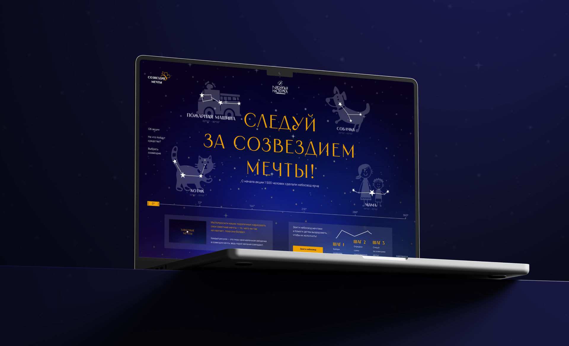 «Следуй за созвездием мечты!» — под таким названием мы и отправились зажигать небесные тела, чтобы осветить детям путь к исполнению их сокровенных мечтаний. Для этого мы отрисовали 24 созвездия, основой которых стали рисунки подопечных фонда, определили координаты и разместили их на карте небосвода.
